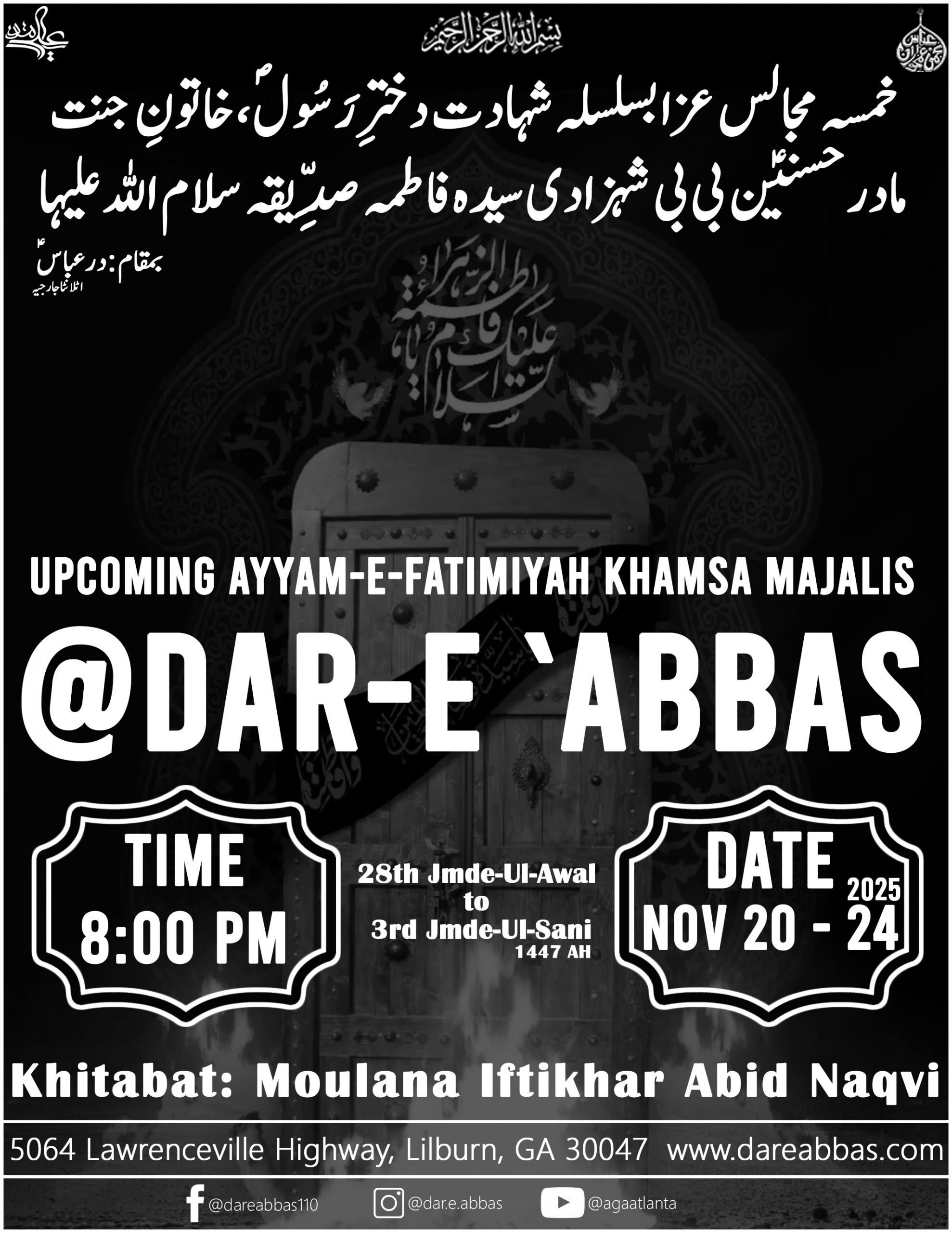 Dar-e ‘Abbas (AS) is an Islamic Shia Center (Imambargah) located on Lawrenceville Highway in Southern Gwinnett County of Metro Atlanta, Georgia USA. Saheb-e-Biyaz of Anjuman Ghamkhwaran-e-Abbas, Ali Zia Rizvi is one of our Trustees. The name Dar-e ‘Abbas means “the Door of Abbas (as)” in the Persian language, a reference to the Valiant Muslim Hero Abbas Bin Ali Bin Abu Talib A.S.