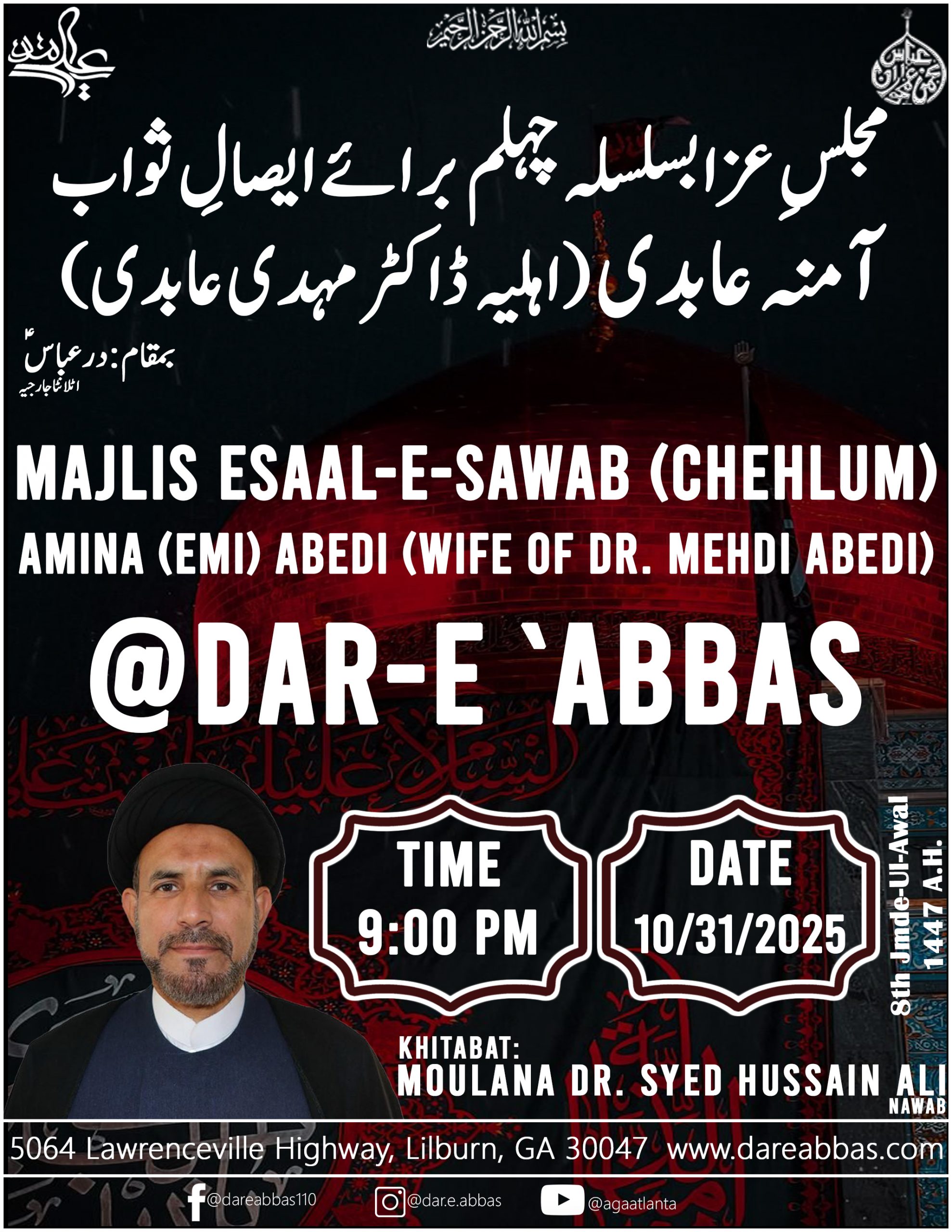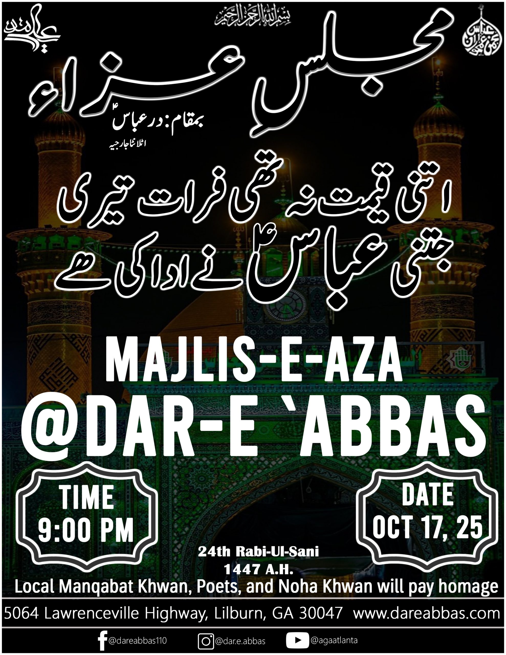Dar-e ‘Abbas (AS) is an Islamic Shia Center (Imambargah) located on Lawrenceville Highway in Southern Gwinnett County of Metro Atlanta, Georgia USA. Saheb-e-Biyaz of Anjuman Ghamkhwaran-e-Abbas, Ali Zia Rizvi is one of our Trustees. The name Dar-e ‘Abbas means “the Door of Abbas (as)” in the Persian language, a reference to the Valiant Muslim Hero Abbas Bin Ali Bin Abu Talib A.S.
