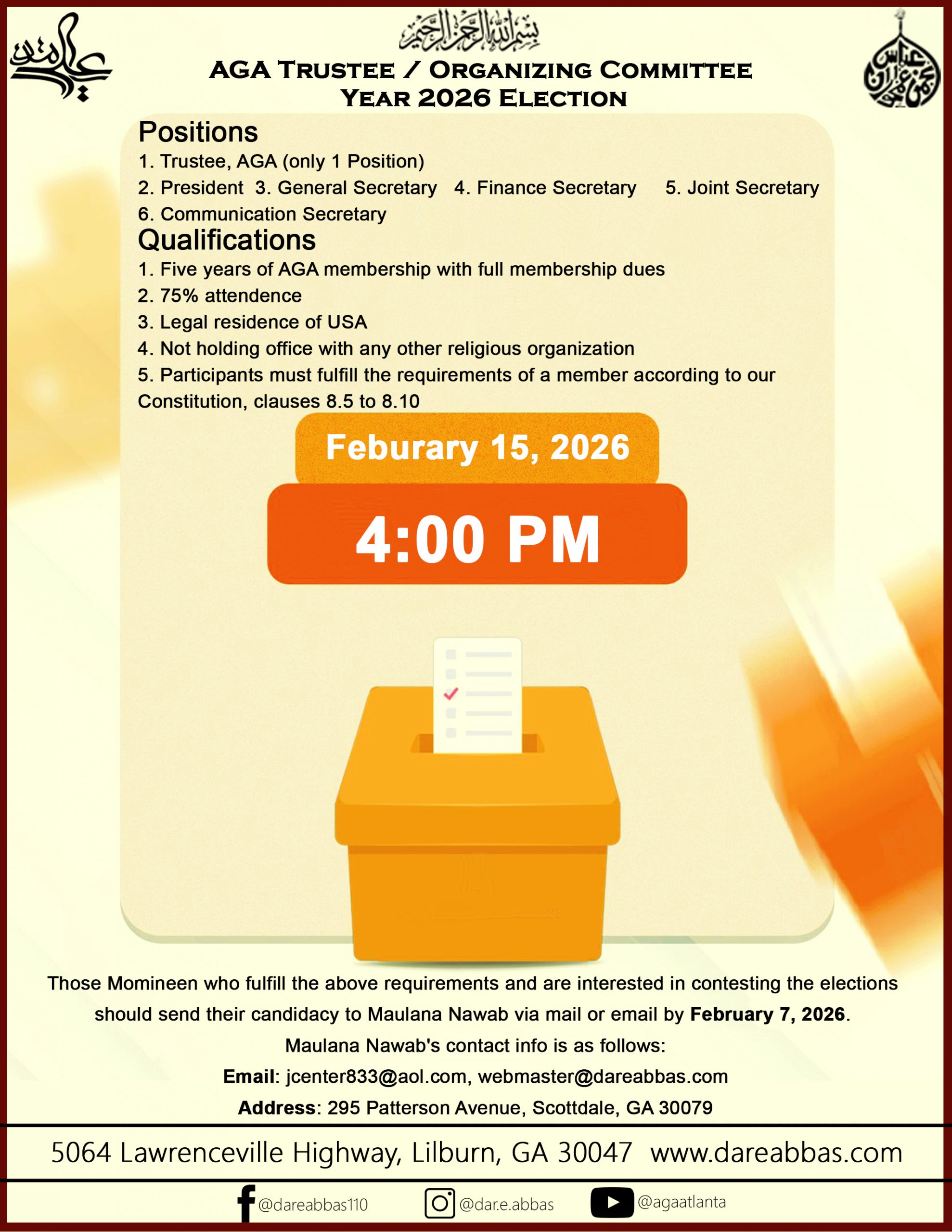 27th Shaban | AGA Trustee / Organizing Committee Year 2026 Election | N/A | N/A |