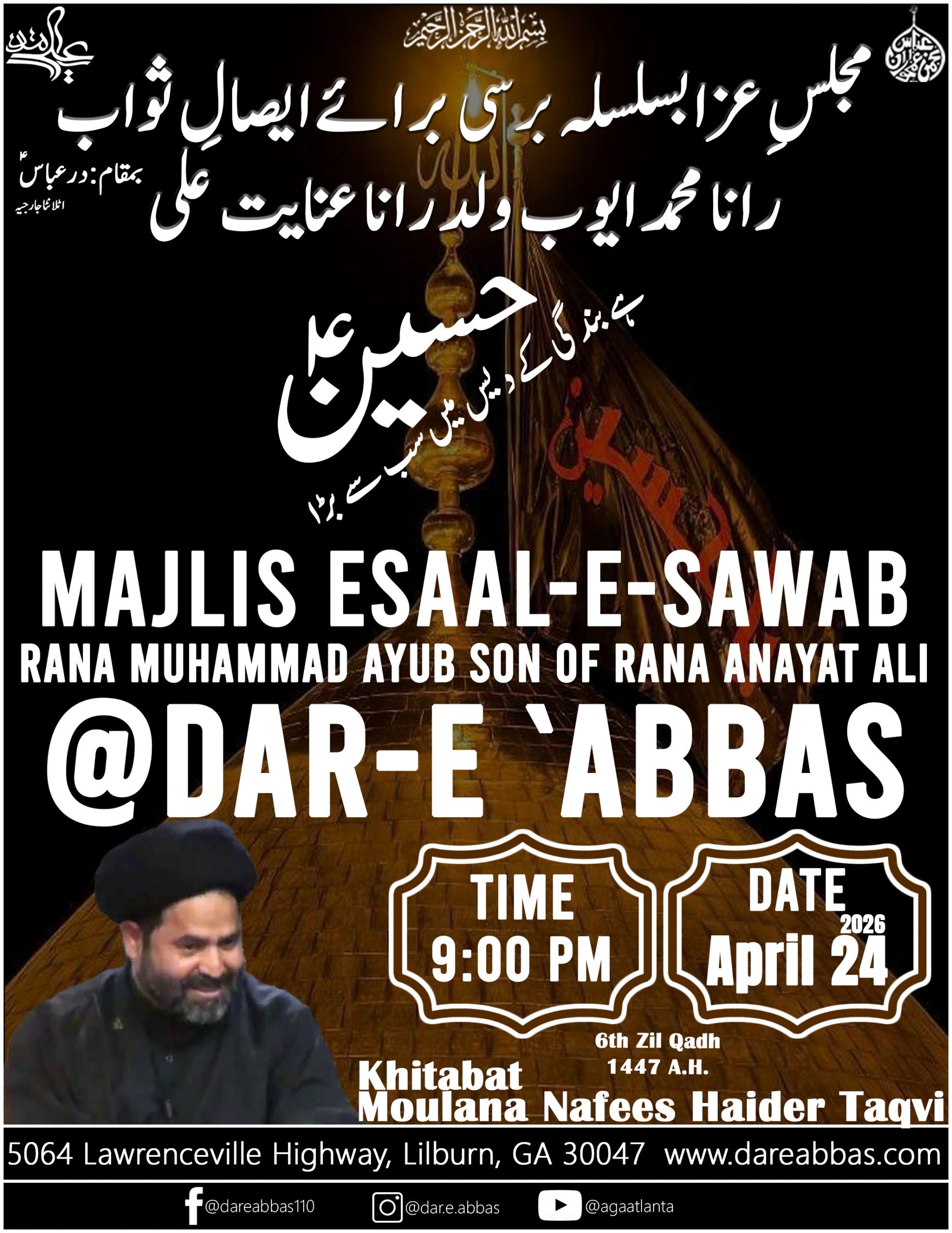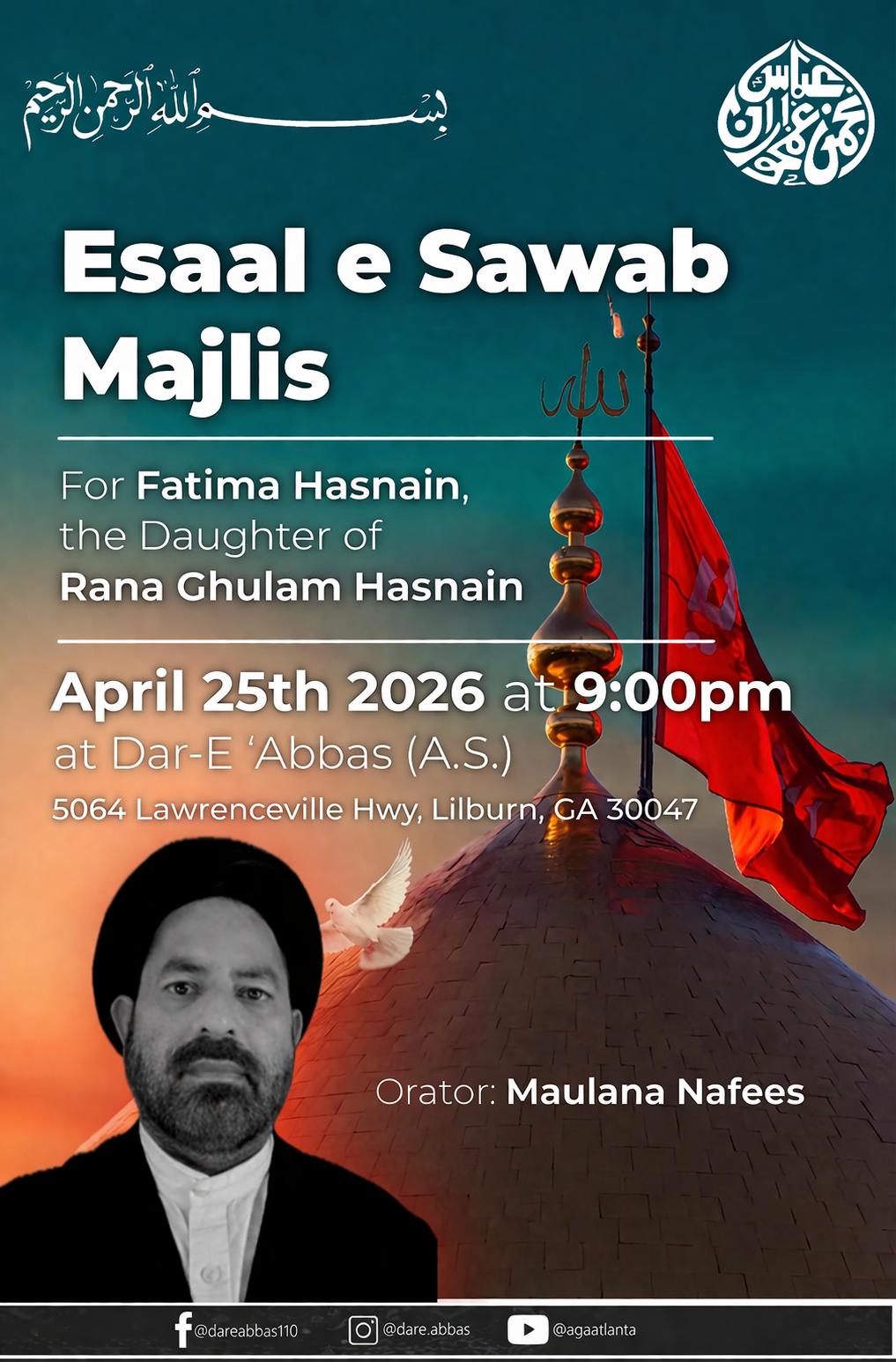 | April 25, 2026 | 7th Zil Qadh | Majlis Esaal-e-Sawab (Barsi) – Fatima Hussnain d/o Rana Ghulam Hussnain | Moulana Nafees Taqvi | Rana Ghulam Hasnain |
